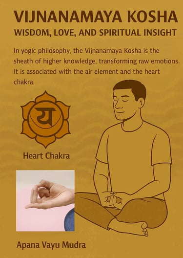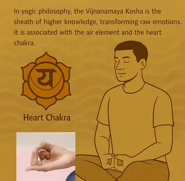 The Vijnanamaya Kosha is governed by the air element, which represents movement, expansion, and subtlety. Air is the bridge between the tangible and intangible — just like wisdom is the bridge between emotion and truth.Chakra: Heart Chakra (Anahata)